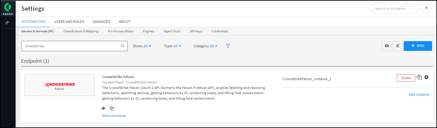 2. Click Settings in the left navigation menu, search for crowdstrike to locate it among other instances.