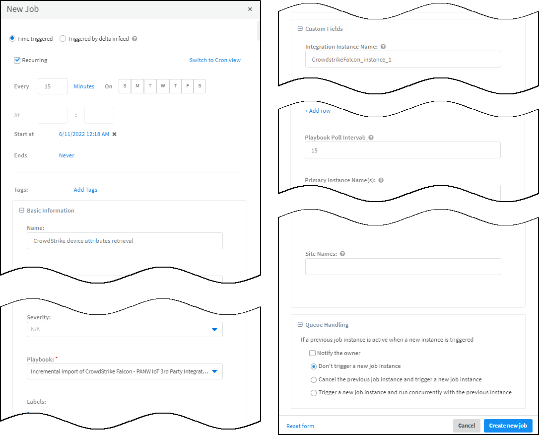 Every: Enter a number and set the interval value (Minutes, Hours, Days, or Weeks) and select the days on which to run the job. (If you don’t select anything, the job runs everyday.) This determines how often XSOAR imports data from CrowdStrike. It’s important to set an interval that allows enough time for the job to complete, considering factors such as the number of devices that are active on the network. You might start by running the job every 15 minutes and then increasing it as necessary until each job completes before the next one starts. You can see the run status of a recurring job on the Jobs page. When in progress, its status is Running. When done, its status changes to Completed.