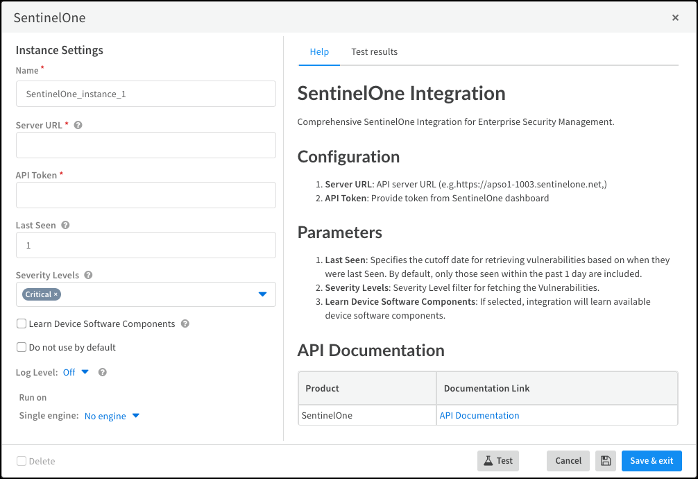 - Click the active integration instance settings icon, or click Add instance, to open the settings panel.Enter the following settings and leave the others at their default values:Name: Use the default name or enter a new one to help you identify the instance.Server URL: Enter the URL of your SentinelOne Singularity server.API Token: Enter the API token for SentinelOne.Optional Last Seen: Enter the time range in days that you want to get device or vulnerability information from SentinelOne. Device Security polls for all vulnerabilities or devices identified or updated in the specified time. By default, the SentinelOne jobs retrieve devices or vulnerabilities last seen in the past one day.Optional Severity Levels: Select the severity levels for vulnerabilities that you want to import from SentinelOne to Device Security. By default, Device Security imports only vulnerabilities with a severity level of Critical.Optional Learn Device Software Components: Select if you want the import job to include information about software components running on the devices from SentinelOne.Cloud-based Cortex XSOAR Run on Single engine: When using a cloud-based Cortex XSOAR instance and an on-premises SentinelOne Singularity server, choose the Cortex XSOAR engine that you want to communicate with the SentinelOne server.