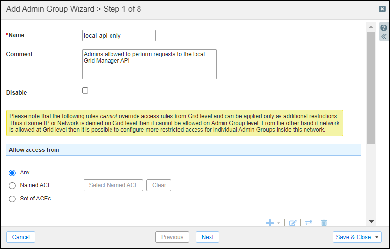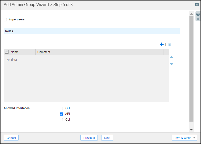 - Click Next four times to reach step 5 of 8 and then select API as an allowed interface.