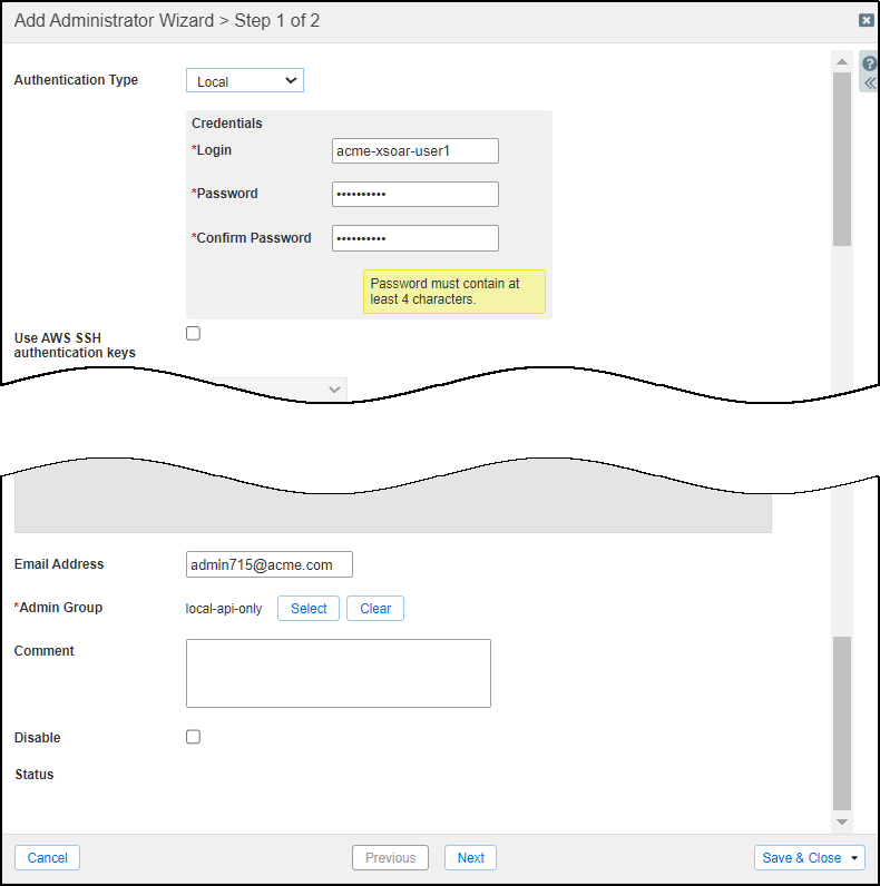 Create a user for the XSOAR engine to use when connecting to the Infoblox API and add it to the group.- Select Admins+ (Add) and then enter the following:Authentication Type: LocalLogin: Enter a username for the XSOAR engine to use when connecting to the Infoblox API.Password and Confirm Password: Enter a password for the XSOAR engine to use.Email Address: (Optional) Enter the email address of someone who’s responsible for the integration in case any issues arise in the future.Admin Group: Choose the name of the admin group you created to access the API.