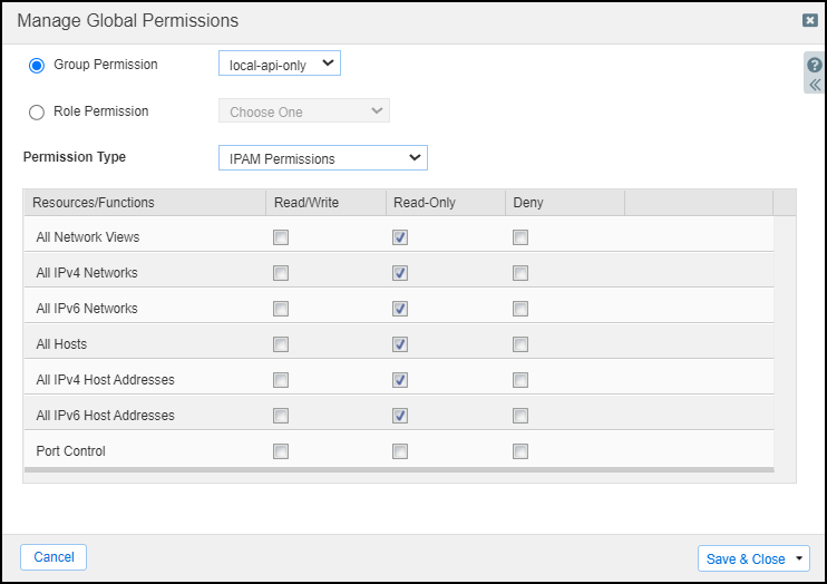 - Select Permissions+ (Add), select Group Permission, choose the name of the user group you just created, choose IPAM Permissions as the Permission Type, and then select Read-Only for the following resources:All Network ViewsAll IPv4 NetworksAll IPv6 NetworksAll HostsAll IPv4 Host AddressesAll IPv6 Host Addresses