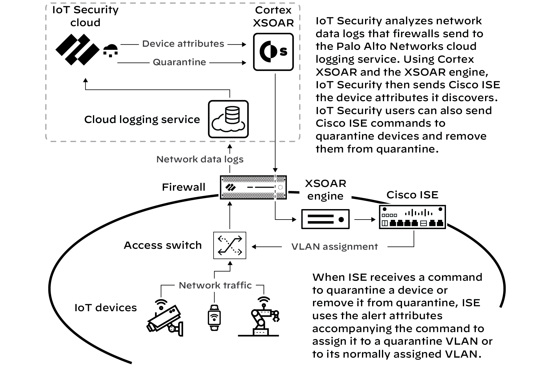 Palo Alto Networks Device Security can integrate through Cortex XSOAR with Cisco ISE (Identity Services Engine) to populate custom endpoint attributes on one or more ISE instances with data discovered in the network traffic that Device Security analyzes. If a device is already in the ISE inventory, ISE adds the attributes from Device Security to it. If Device Security sends attributes for a device that isn’t in the ISE inventory, ISE treats it as a new endpoint, adds it to their inventory, and includes all the related attributes that Device Security sends.