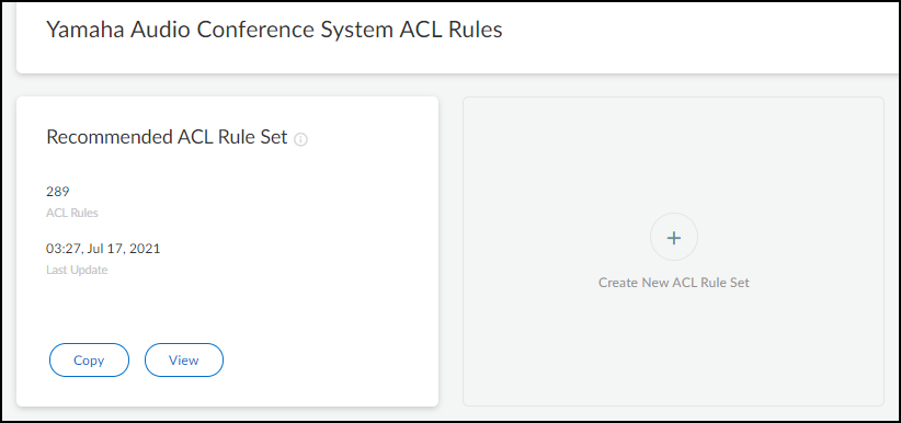 Create a new ACL rule set based on the recommended set.You can also click + to create a new rule set based on the recommended rule set or on another one you’ve previously defined. When creating a new rule set, you have the same options explained below with the additional option of copying rules from a set of your choice.- Click Copy.The Copy Recommended ACL Rule Set dialog box appears.