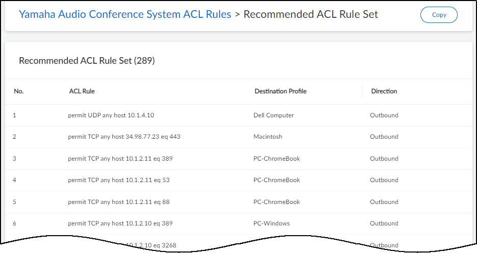 The source profile is unstated because it’s always this device profile. For destinations with devices that Device Security has identified, typically because they are in the local network that Device Security is monitoring, it displays the appropriate destination profile. For destinations that Device Security cannot identify, typically because they’re beyond the local network, it categorizes them into a destination profile called external.Because these automatically generated rules are based on normal device behavior, each ACL rule permits a type of network behavior. The rule specifies the protocol type it is permitting from “any” IP address within the source profile to the specified host IP address within the destination profile. If the rule includes a destination port number, traffic using the specified protocol is only permitted to the destination host on that port. If no port number is included, then traffic using the protocol is permitted to the destination on any port.The Direction column indicates if the traffic is outbound or inbound from the perspective of the source profile. It’s outbound if traffic originates from a device in the source profile and is bound for a destination in the destination profile, and it’s inbound if traffic originates in the destination profile and is destined for a device in the source profile.
