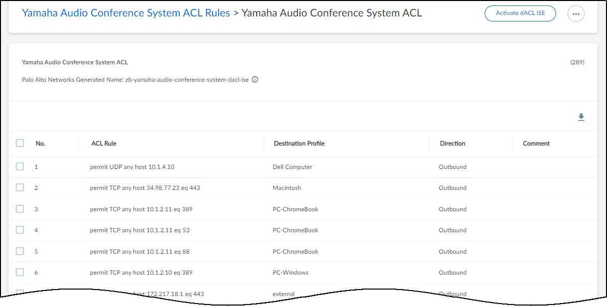 The ACL rule set name appears near the top of the page. All automatically generated ACL rule set names in the Device Security portal are lowercase, use hyphens, begin with zb-, and end with -dacl-ise. However, in XSOAR the capitalization changes, hyphens become underscores, and the prefix and suffix switch to iot_ and _dACL. For example: (Device Security) zb-yamaha-audio-conference-system-dacl-ise becomes (XSOAR and Cisco ISE) iot_Yamaha_Audio_Conference_System_dACL