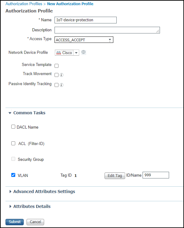 2. Create an authorization profile that allows IoT devices to access the network and associates them with the quarantine VLAN.