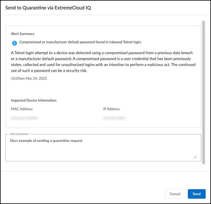 - Select an alert on AlertsSecurity Alerts in Device Security in Strata Cloud Manager.You can only select one device at a time to quarantine.Click MoreSend to…Quarantine via ExtremeCloud IQ.