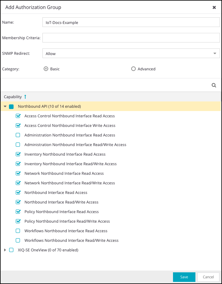 To enable Device Security to integrate with your Extreme Networks ExtremeCloud IQ Site Engine instance, you need access to the Northbound Interface API. In ExtremeCloud IQ Site Engine, configure a client and add the client to an authorization group with the following privileges for the Northbound Interface API: