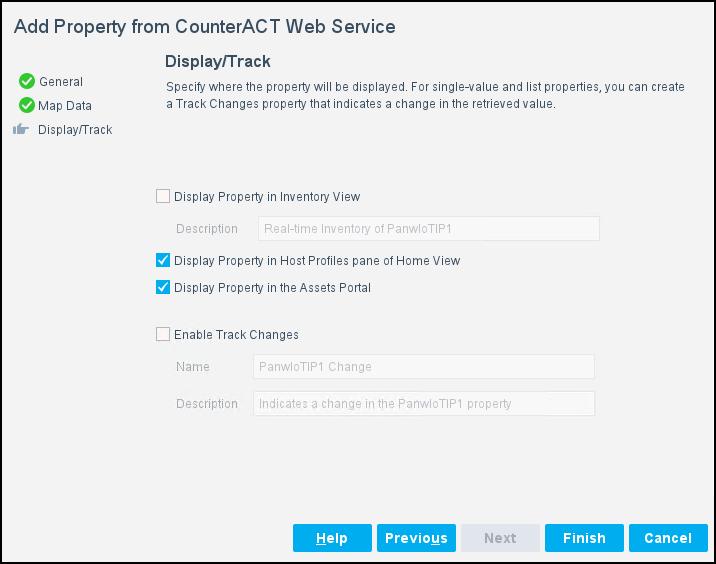 5. On the Display/Track panel, select the places in the Forescout UI where you want the host property to appear and then click Finish.