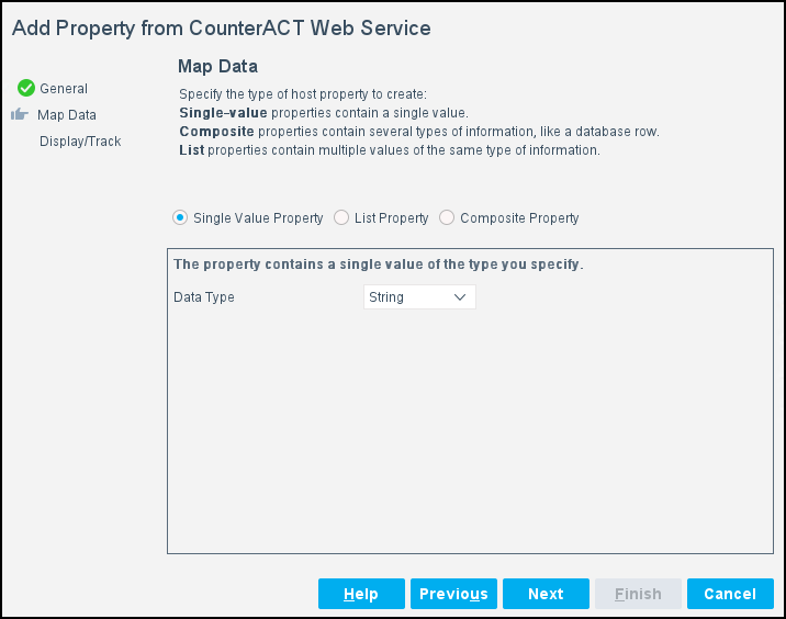 4. On the Map Data panel, select Single Value Property, choose String in the Data Type drop-down list, and then click Next.