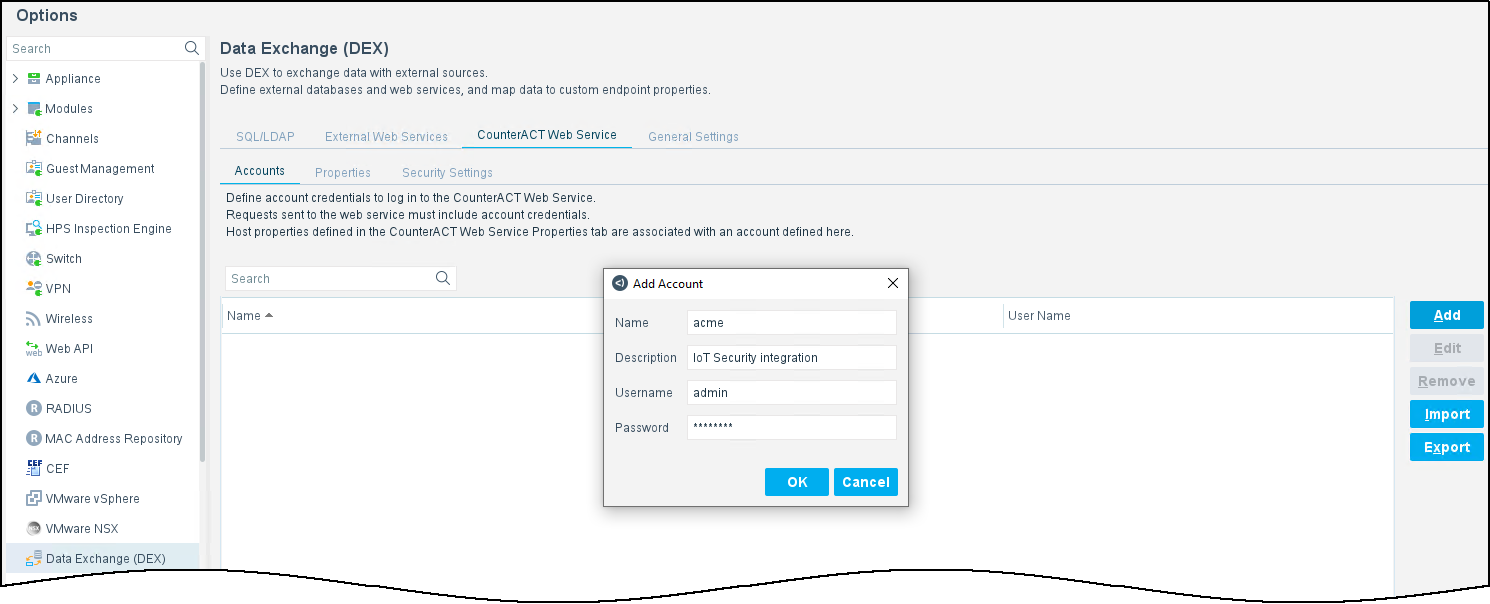 2. In the Data Exchange (DEX) section, click CounterACT Web ServiceAccounts and then Add.