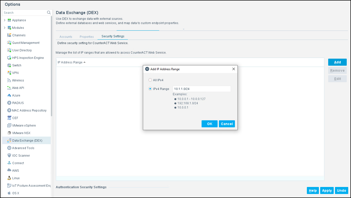 2. Select either All IPv4 or IPv4 Range. If you select IPv4 Range, enter the IP address, range, or subnet from which Forescout will accept connections and then click OK. Make sure it includes the XSOAR engine IP address.