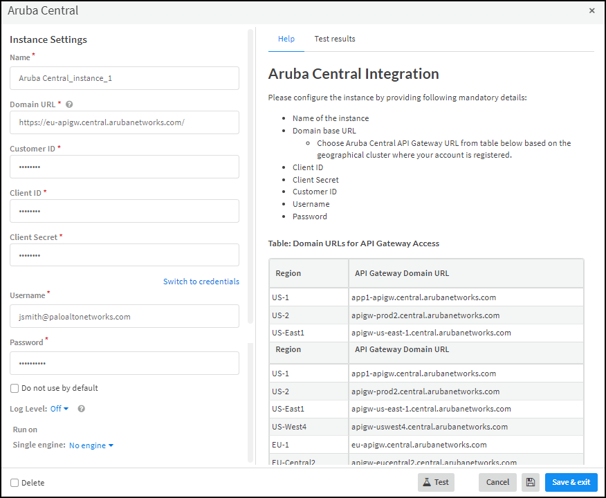 - Enter the following settings:Name: Use the default name of the instance or enter a new one.Remember the instance name because you are going to use it again when creating a job that Cortex XSOAR will run to gather device data from the Aruba Central instance specified in this integration instance.Domain URL: Enter the domain URL of a cloud-hosted Aruba Central instance or the FQDN of an on-premises Aruba Central server.Customer ID: Copy and paste the customer ID that you copied from the Aruba Central UI and pasted and saved in a text file.Client ID: Copy and paste the client ID that you copied and saved from the Aruba Central UI.Client Secret: Copy and paste the customer ID that you copied and saved from the Aruba Central UI.Username: Type the name of the read-only user account that you previously created for the XSOAR engine to use when connecting to the Aruba Central API.Password: Type the password associated with the user account.Use single engine: When using a cloud-based XSOAR instance and an on-premises Aruba Central server, choose the XSOAR engine that you want to communicate with the Aruba Central server.
