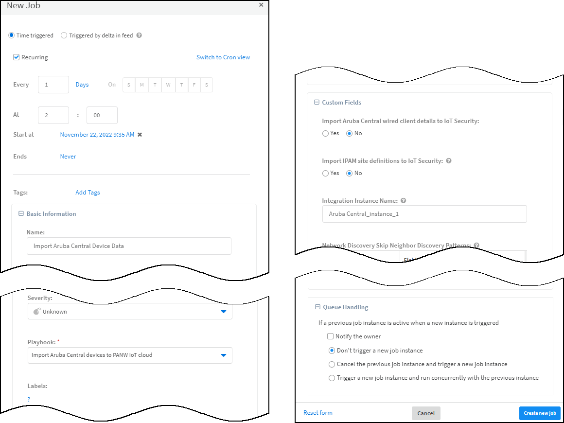 - In the New Job panel that appears, enter the following and leave the other settings at their default values:Recurring: Select this if you want to periodically import device information from Aruba Central. Clear it if you want to import data on demand.Every: If you select Recurring, enter a number and set the interval value (Minutes, Hours, Days, or Weeks) and select the days on which to run the job. (If you don’t select specific days, then the job will run everyday by default.) This determines how often XSOAR queries Aruba Central for information about its devices. For example, every day at 2:00 AM.Name: Enter a name for the job.Playbook: Choose Import Aruba Central Device Data.Import Aruba Central wired client details to Device Security: Select to import device information for both wired and wireless devices. Clear to import device information for wireless devices only.Integration Instance Name: Paste the instance name you copied a few moments ago.