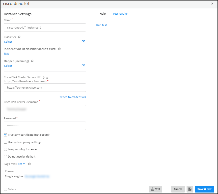 - Enter the following and leave other settings at their default values:Name: Use the default name of the instance or enter a new one.Remember the instance name because you're going to use it again when creating jobs that Cortex XSOAR will run.Cisco DNA Center Server URL: Enter the Cisco DNA Center Server URL.Cisco DNA Center username: Enter the name of the user account you previously created in Cisco DNA Center with read-only permission to access its API.Password: Enter the password associated with the user account.Run on Single engine: Choose the XSOAR engine that you want to communicate with the Cisco DNA Center system.