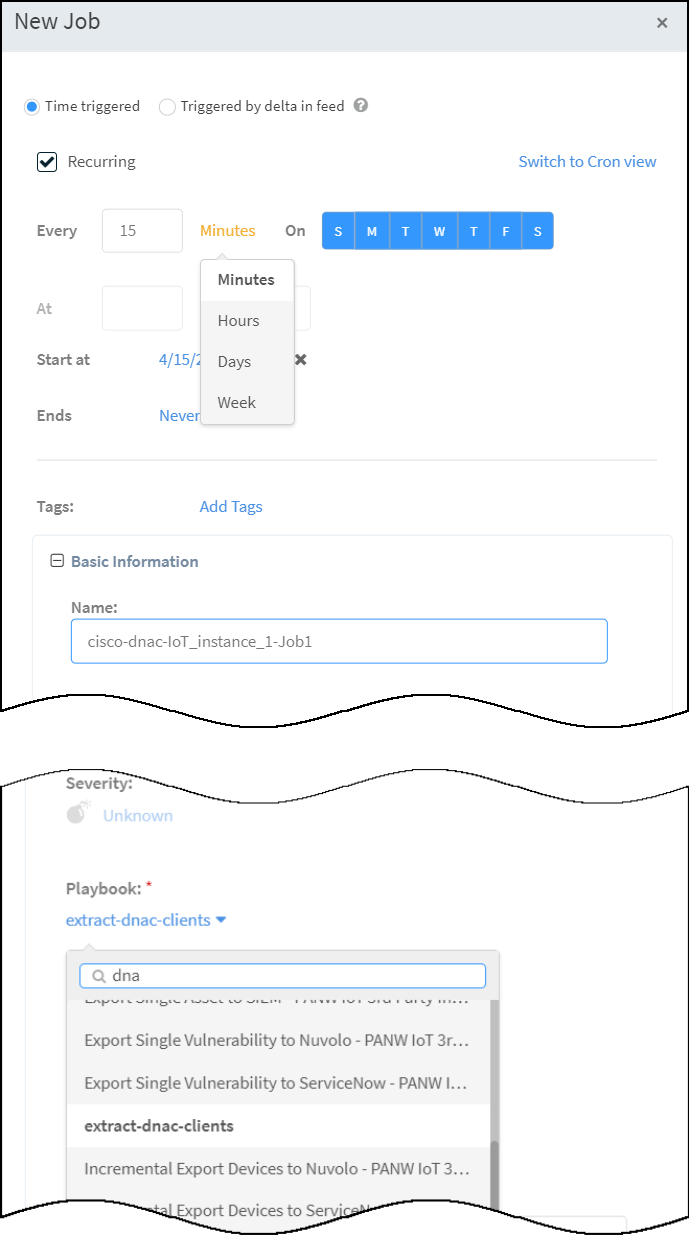 Enable the Cisco DNA Center integration instance.Create a job for Cortex XSOAR to query Cisco DNA Center for device information.Copy the name of the instance you created, navigate to Jobs, and then click New Job at the top of the page.In the New Job panel that appears, enter the following and leave the other settings at their default values:Recurring: Select this because you want to periodically poll the DNA Center for device details.Every: Enter a number and set the interval value (Minutes, Hours, Days, or Weeks) and select the days on which to run the job. This determines how often XSOAR sends a list of MAC addresses of currently active devices from Device Security to Cisco DNA Center and receives device details in response.Generally, this job takes about 15 minutes per 1,000 devices to complete. Other factors that might affect the time required to complete a job are the Cisco DNA Center API processing speed and settings.Name: Enter a name for the job.Playbook: Choose the playbook that you want to use.- extract-dnac-clients - When running this playbook, Cortex XSOAR only requests details from Cisco DNA Center if a device has a MAC address. If your network has static IP devices without MAC addresses, they won't be included. Using this playbook, Device Security does not learn any new devices.