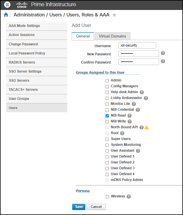 3. On the General tab, enter the following to create a read-only user account for an XSOAR engine to use when authenticating itself to Cisco Prime and then click Save: