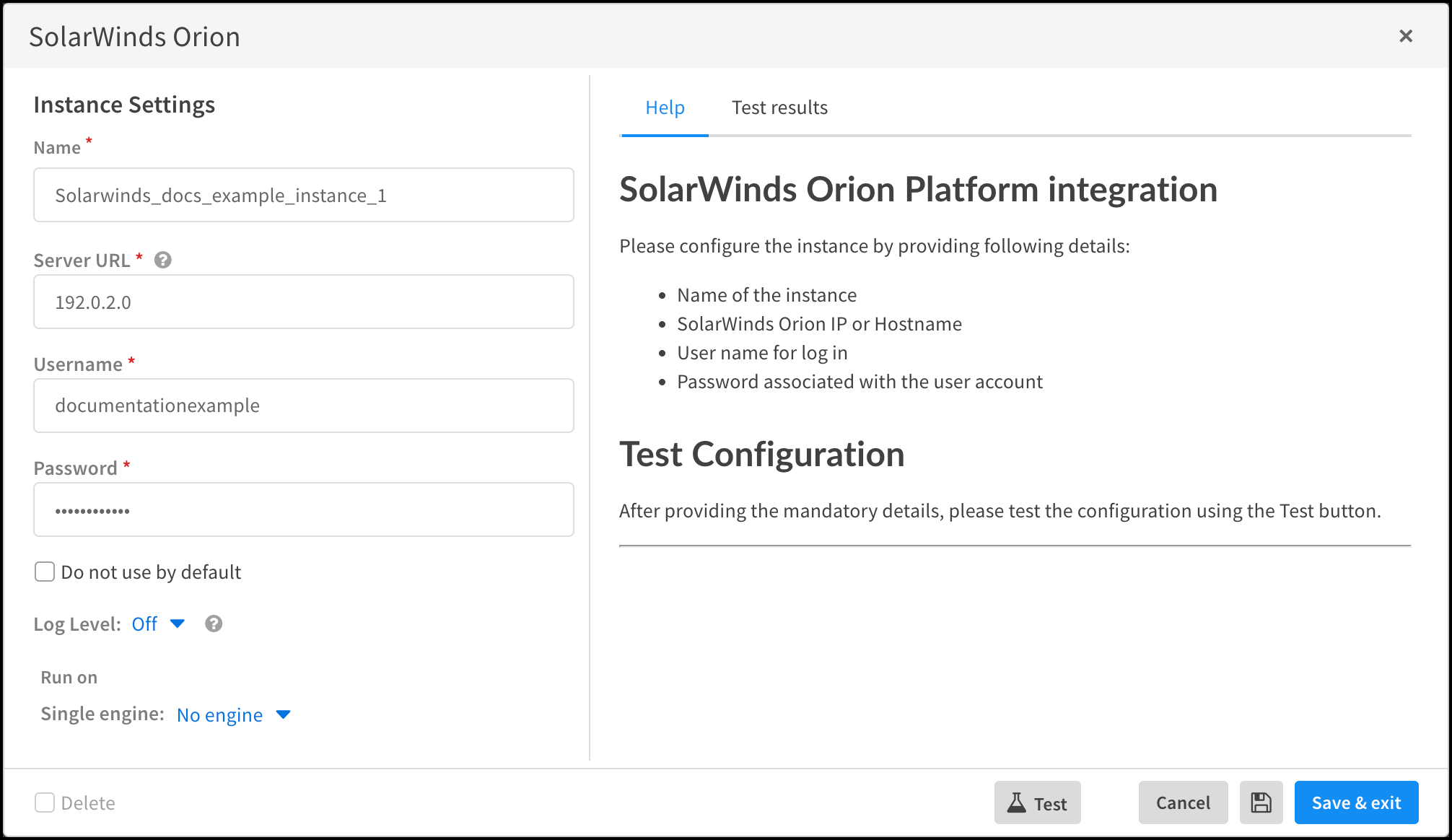 • Optional Run on Single engine: Choose the Cortex XSOAR engine you want to use if you're connecting to an on-premises SolarWinds Platform.