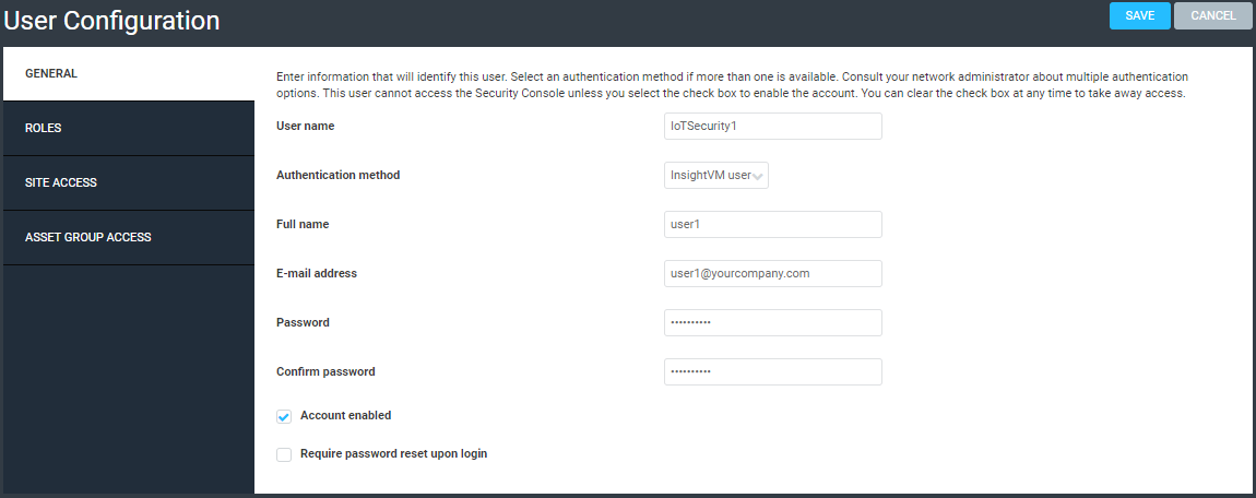 - In the General tab, enter the following:User Name: Enter the name for the user account such as IoTSecurity1.Authentication method: InsightVM userFull name: Enter a name such as user1.E-mail address: Enter your email address.Password and Confirm Password: Enter a password for the user account.Passwords must be at least six characters long.Account enable: (select)