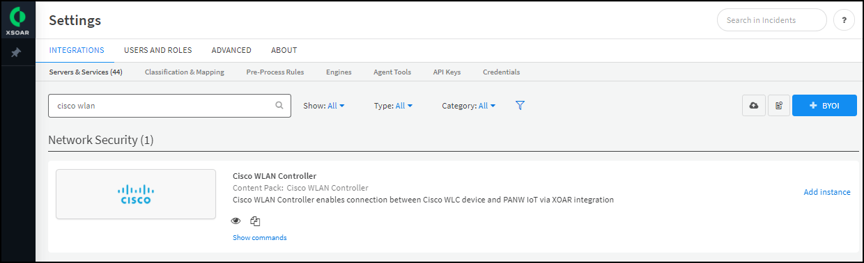 - Device Security uses Cortex XSOAR to integrate with Cisco WLAN controllers, and the settings you must configure to integrate with it are in the XSOAR interface. To access these settings, click Launch Cortex XSOAR.The Cortex XSOAR interface opens in a new browser window.