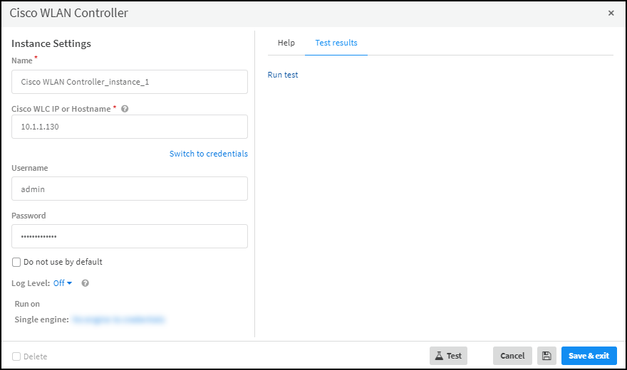- Enter the following settings:Name: Use the default name of the instance or enter a new one.Cisco WLC IP or Hostname: Enter the IP address or hostname of the wireless controller.Username: Type the name of the user account that you previously created for the XSOAR engine to use when connecting to the WLAN controller.Password: Type the password associated with the user account.Run on Single engine: Choose the XSOAR engine that you want to communicate with this Cisco WLAN controller.