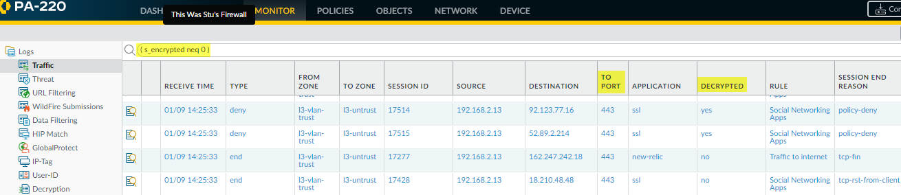 View All TLS and SSH Traffic—Filter the Traffic Logs (MonitorLogsTraffic) to view both decrypted and undecrypted TLS and SSH traffic, use the filter ( s_encrypted neq 0 ):