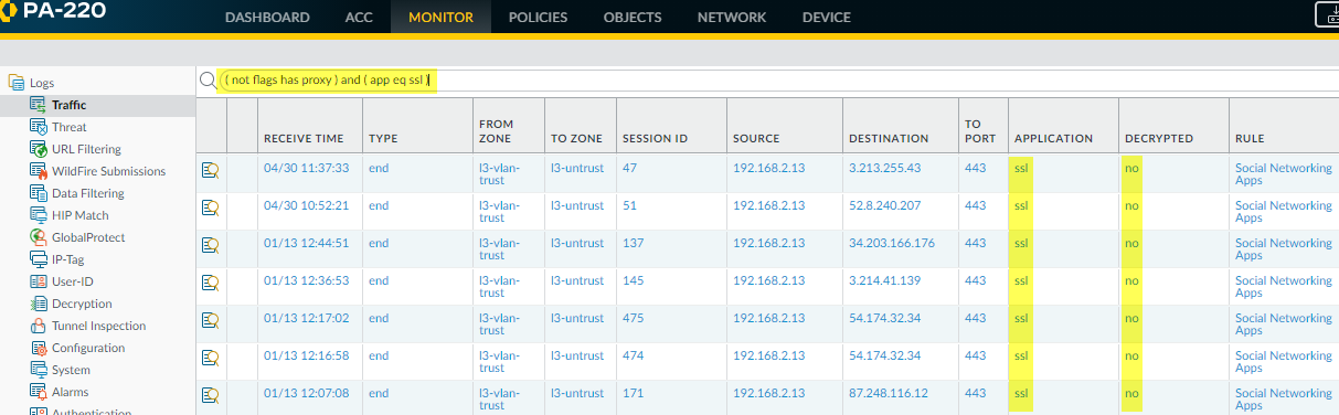 View SSL Traffic Sessions That Are Not Decrypted—Filter the Traffic Logs (MonitorLogsTraffic) using the filter ( not flags has proxy ) and ( app eq ssl ).This filter displays only logs in which the SSL proxy flag is off (meaning only encrypted traffic) and the traffic is SSL traffic; every log entry has the value no in the Decrypted column and the value ssl in the Application column.