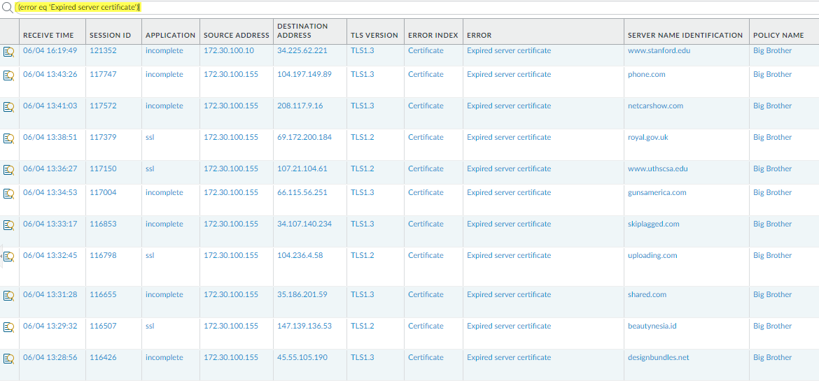 This query identifies servers that generate Expired server certificate errors. The NGFW blocks access to these servers because of the expired certificate.