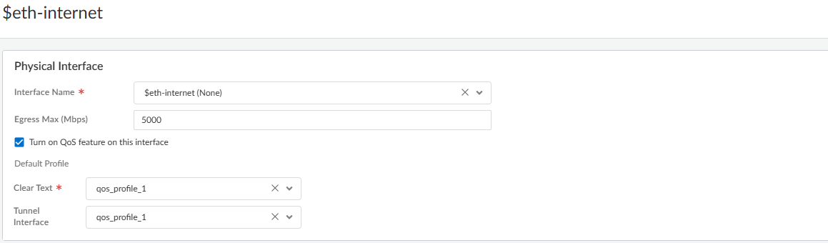 Enable QoS on a egress interface.Part of this step includes the option to select cleartext and tunneled traffic for unique QoS treatment.Check if the firewall model you’re using supports enabling QoS on a subinterface by reviewing a summary of the Product Specifications.- Select Configuration NGFW and Prisma AccessNetwork PoliciesQoSQoS Interfaces and Add QoS Interface.Select Physical Interface and choose the Interface Name of the interface on which to enable QoS.In the example, Ethernet 1/1 is the egress interface for web-browsing traffic (see step 2).Set the Egress Max bandwidth for all traffic exiting this interface.It is a best practice to always define the Egress Max value for a QoS interface. Ensure that the cumulative guaranteed bandwidth for the QoS Profile attached to the interface does not exceed the total bandwidth allocated to the interface.Select Turn on QoS feature on this interface.In the Default Profile section, select a QoS Profile to apply to all Clear Text traffic exiting the physical interface.(Optional) Select a default QoS Profile to apply to all tunneled traffic exiting the interface.For example, enable QoS on Ethernet 1/1 and apply the bandwidth and priority settings you defined for the QoS Profile Limit Web Browsing (step 4) to be used as the default settings for cleartext egress traffic.