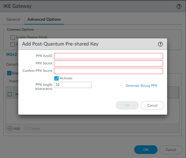 - Select Advanced OptionsIKEv2PQ PPK (post-quantum pre-shared key).To use post-quantum resistance features on the VPN, Enable Post-Quantum Pre-Shared Key (PPK). This option is disabled by default.Select (or deselect) this option for all dynamic peer IKE gateways on the same local IP address.For IKEv2 negotiation and to support RFC 8784, configure and activate at least one PPK.Set the Negotiation Mode to Preferred or Mandatory.Enable the same mode for dynamic peer IKE gateways on the same local IP address.