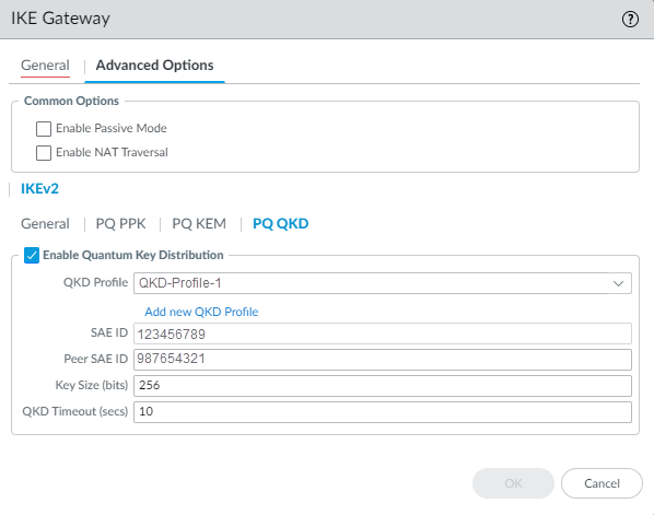 Select Advanced Options and configure the non-quantum options. Select IKEv2 and configure the General settings.General enables you to add an IKE Crypto profile, enable IKEv2 Fragmentation, and set the Liveness Check.Enable Quantum Key Distribution to use QKD.- Select the QKD Profile, which you created previously, from the drop-down.Enter the Peer SAE ID, the serial number of the peer firewall on the other end of the VPN connection.The firewall pre-populates the SAE ID and can’t be changed.Set the Key Size (bits) of the key returned from the QKD KME device. The default value is 256 bits.A larger symmetric key provides higher resistance to a quantum attack using Grover's Algorithm. Use a minimum of 256 bits.Set the QKD Timeout (secs) in seconds. The default value is 10 seconds.Click OK to create the IKE Gateway.