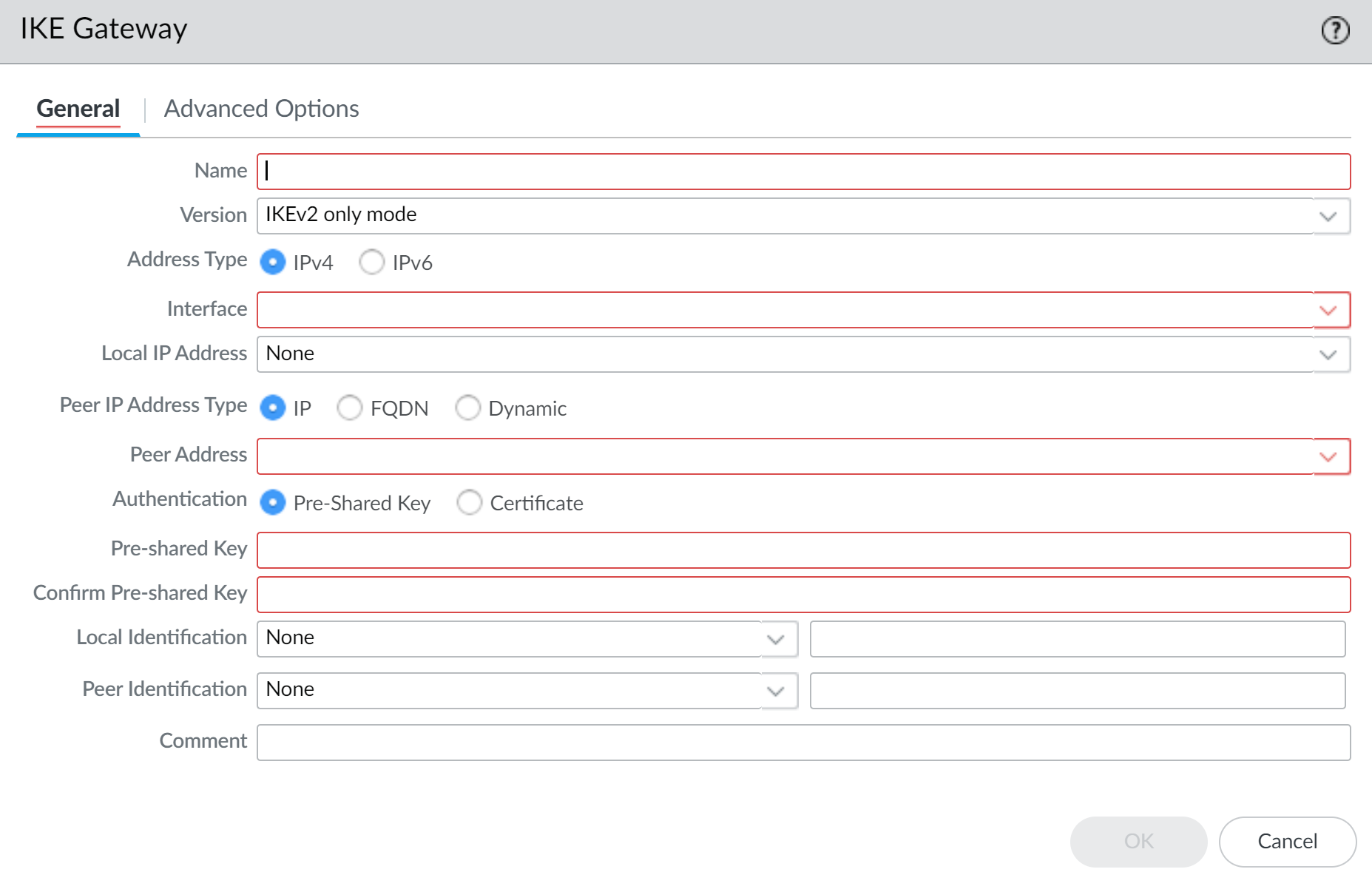 - Select NetworkNetwork ProfilesIKE Gateways and Add a new gateway.Configure the General settings and select either IKEv2 only mode or IKEv2 preferred mode as the Version.In IKEv2 only mode, if the peer does not support IKEv2, the firewall aborts the connection. In IKEv2 preferred mode, if the peer does not support IKEv2, the firewall falls back to IKEv1. However, the VPN must negotiate IKEv2 to use the post-quantum VPN features, so if the firewall falls back to IKEv1, those features are not available.IKEv1 is considered to be weak. If both IKE peers can support it, upgrade your VPN connections to IKEv2 and select IKEv2 only mode to ensure adequate levels of security and the ability to use PQ VPNs.