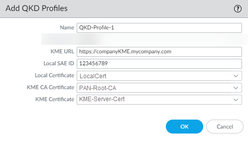 - Select DeviceSetupQuantum and Add a new QKD Profile.Enter a descriptive Name for your QKD profile.Enter the KME URL of your local KME device.Enter the Local SAE ID.Select the Local Certificate, used to authenticate the firewall with the KME, from the drop-down.Select the KME CA Certificate, the KME certificate authority, from the drop-down.Select the KME Certificate, the KME server certificate used for authentication, from the drop-down.Click OK.