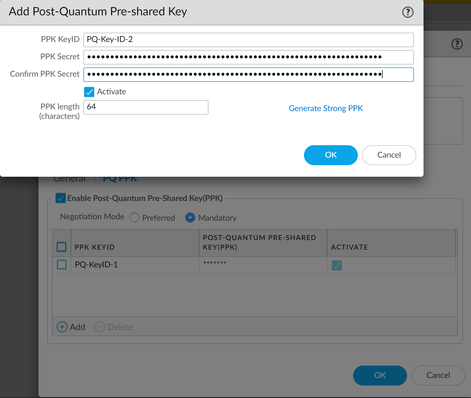 You can give the KeyID for each PQ PPK any name you want. You can configure the PPK secret that you pair with the KeyID for each PQ PPK manually or the firewall can generate a strong PPK secret for you. This example shows you how to use both methods.To create the PQ PPK with a manually configured PPK secret:- Add a PQ PPK.In the Add Post-Quantum Pre-shared Key dialog, enter the PPK KeyID name. In this example, the name is PQ-KeyID-1.Type (or copy and paste from another source) the exact same ASCII string into PPK KeyID and Confirm PPK Secret.Store the PQ PPK (the KeyID and its PPK secret) securely. For manually entered PPK secrets, the secret is never shown in cleartext. If you lose the PPK secret, you can't recover it. (You can delete the PQ PPK and then configure a new one.)If the PPK KeyID and Confirm PPK Secret don't match, the error message PPK Secret and Confirm PPK Secret Do Not Match appears. As a best practice, specify a random PPK secret that's at least 64 characters (32 bytes, or 256 bits of entropy) in length to create a strong key. By default, the new key is active. If you don't want to use the key in negotiation between IKE peers, deselect Activate. If you deactivate the PQ PPK on one peer, you must also deactivate it on the other peer. The following example shows a strong 64-character key (manually entered keys are never displayed in cleartext):