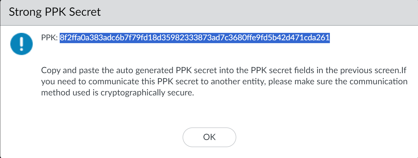 Store the copied PPK secret that the firewall generated securely. After you click OK, the firewall never displays the PPK secret in cleartext again. If you don't copy and securely store the PPK secret now, you won't have it and will need to delete this PQ PPK and configure a new one.With the copied PPK secret still on your clipboard or available to copy from secure storage, click OK. If you didn't copy the PPK secret, generate another strong PPK secret and be sure to copy and securely store it.Paste the copied PPK secret string into both the PPK Secret and Confirm PPK Secret fields in Add Post-Quantum Pre-Shared Key.