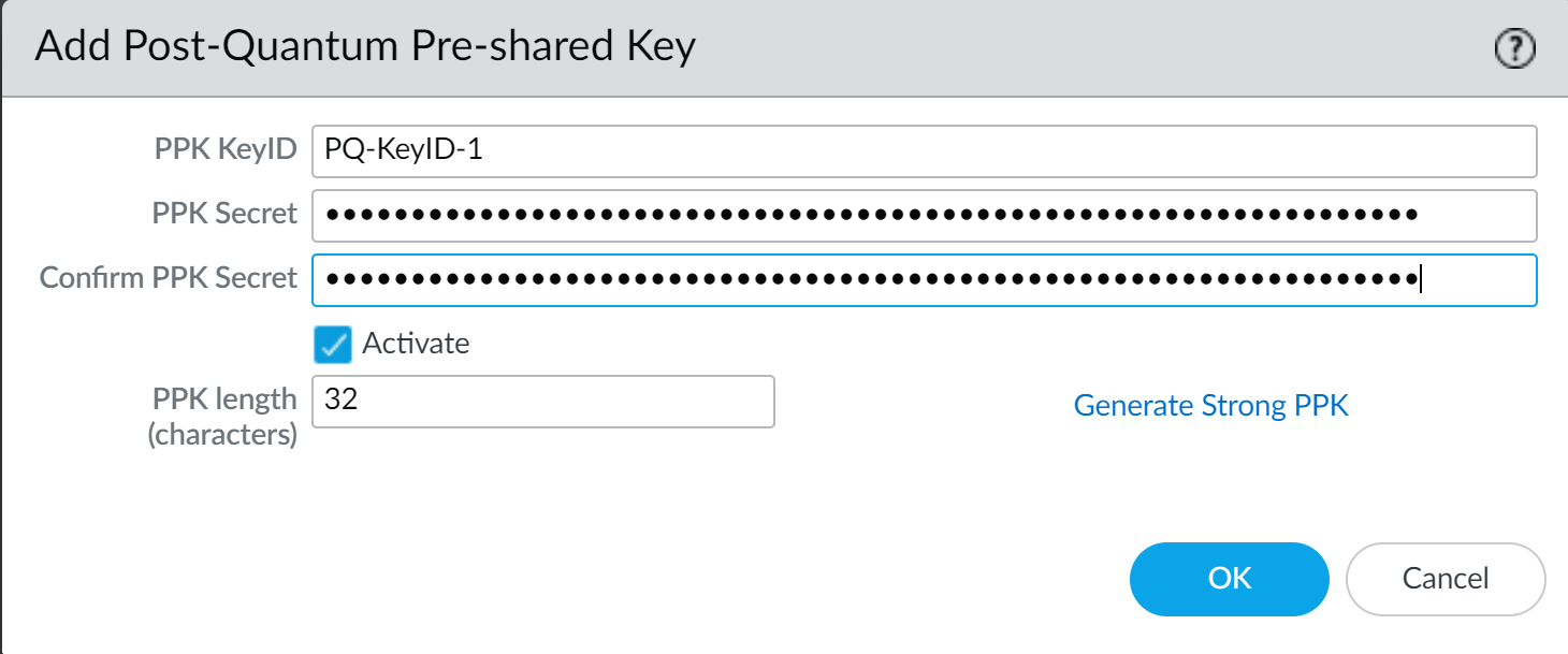 The PPK length (characters) field only applies to keys that the firewall generates for you. It does not control the length of manually configured PPK secret strings.Click OK to install the manually configured PQ PPK.If Panorama manages both peers, you can create the configuration on Panorama and push it to the managed firewalls. If Panorama doesn't manage both peers and a different administrator controls the VPN peer, you securely communicate the PQ PPK to that administrator, who installs it on the peer.To create the PQ PPK with a PPK secret that the firewall generates:- Add a PQ PPK.In the Add Post-Quantum Pre-shared Key dialog, enter the PPK KeyID name. In this example, the name is PQ-Key-ID-2.Set PPK length (characters) to at least 64 characters (32 bytes, or 256 bits of entropy) in length to create a strong key.Click Generate Strong PPK.The firewall generates a strong, random hexadecimal PPK secret of the length configured in PPK length (characters).Highlight and copy the PPK secret string.Copy only the hexadecimal secret. Don't copy the leading PPK: characters. For example, if the generated secret displays as:PPK: 38bcc7f9bd477885541ba0f12b93eb1b8e8ab772ccac1a891802a3abfe132b5dyou only copy:38bcc7f9bd477885541ba0f12b93eb1b8e8ab772ccac1a891802a3abfe132b5dThe leading PPK: is not part of the secret string.