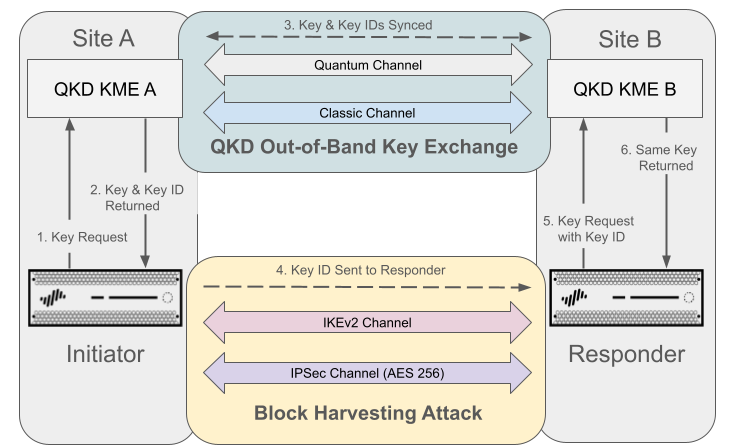 - The Site A QKD device returns a key identified by a unique key ID to the