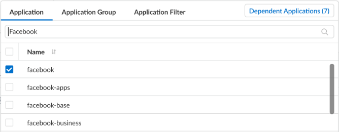 1. Under Application, Select any Applications, Application Groups, or Application Filters you want to safely enable. You can select multiple applications or you can use application groups or application filters. Certain applications may possess application dependency (also shown as Depends on when viewing application details), which you will need to consider for inclusion into the security rule.