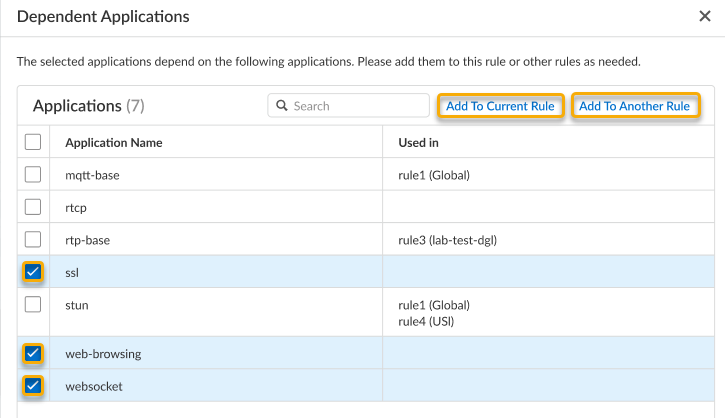 • Additionally, for certain applications, you can select these dependent applications and either Add To Current Rule or Add to Another Rule.