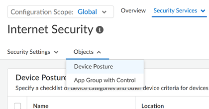 ManageConfigurationNGFW and Prisma AccessSecurity ServicesWeb SecurityObjectsDevice PostureConfigurationNGFW and Prisma AccessSecurity ServicesInternet SecurityObjects Device Posture