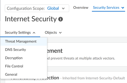 ManageConfigurationNGFW and Prisma AccessSecurity ServicesWeb SecuritySecurity Settings Threat ManagementConfigurationNGFW and Prisma AccessSecurity ServicesInternet SecuritySecurity SettingsThreat Management