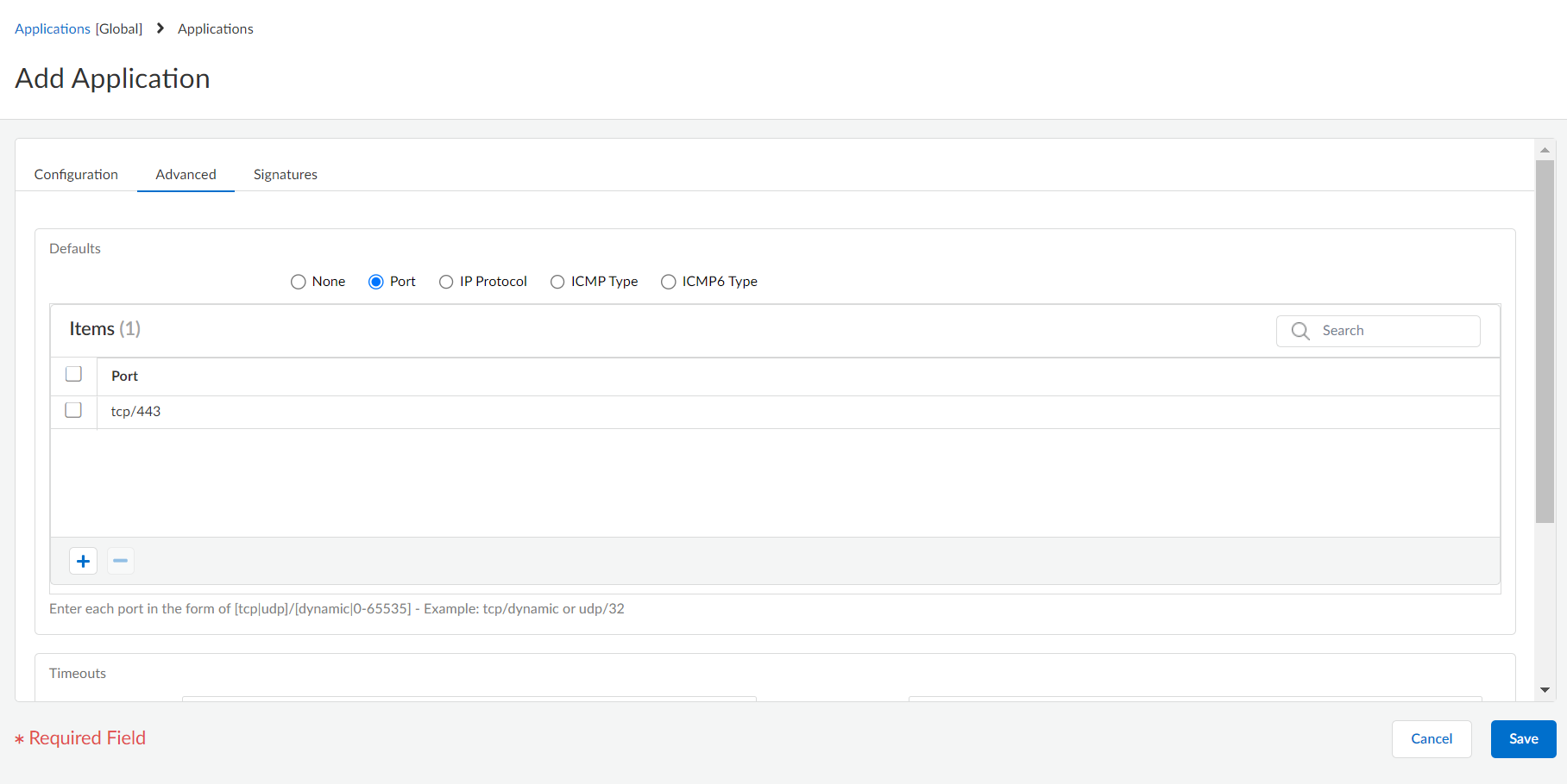 1. Select ManageConfigurationNGFW and Prisma AccessObjectsApplicationApplications and select Add Application.