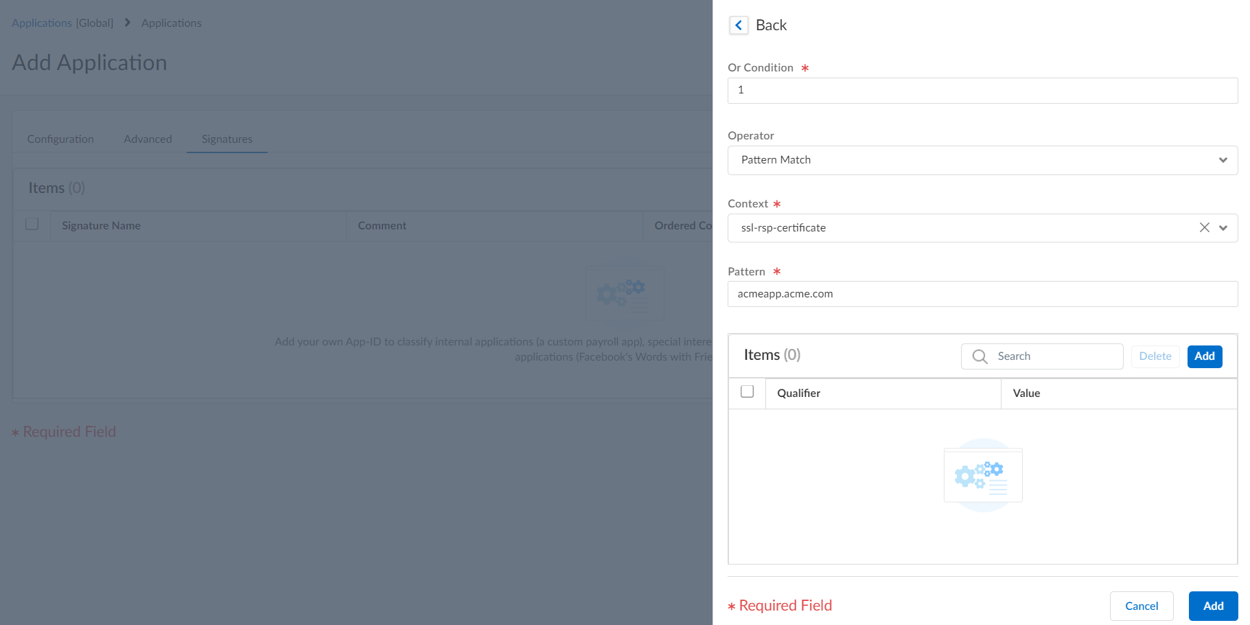 For example, if you're creating a custom application for one of your internal applications, you could use the ssl-rsp-certificate Context to define a pattern match for the certificate response message of an SSL negotiation from the server and create a Pattern to match the Common Name of the server in the message as shown here: