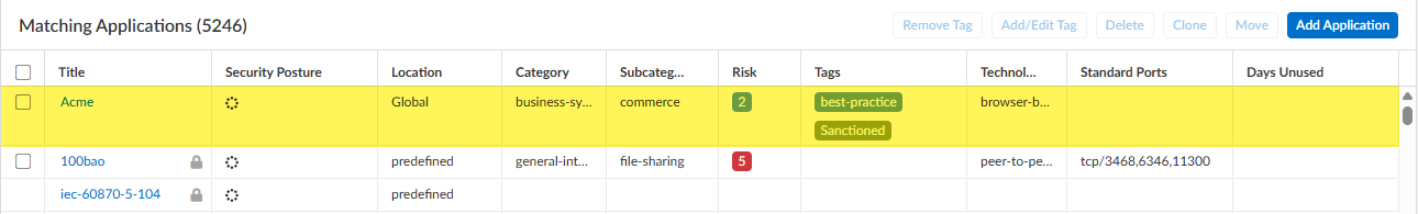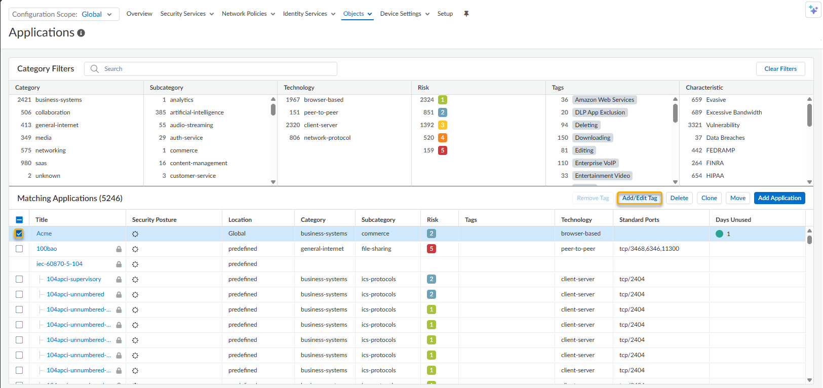 1. Navigate to ManageConfigurationNGFW and Prisma AccessObjectsApplications to view the list of available applications.