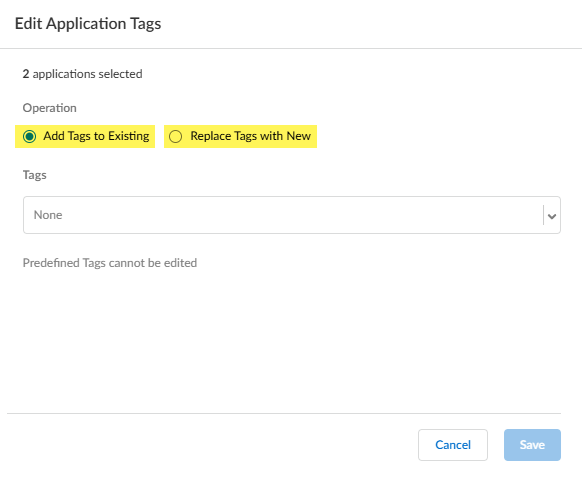 • Add Tags to Existing—adds additional tags to the previously applied tags for the selected applications.