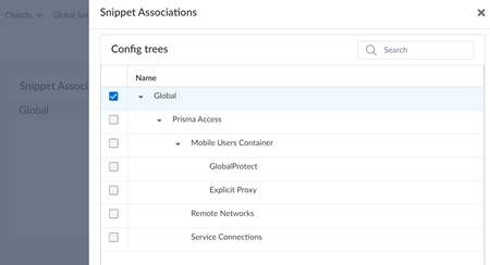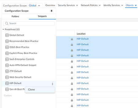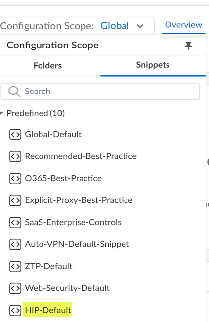 In Strata Cloud Manager, the default HIP objects and HIP profiles are moved from the Global-Default snippet to the HIP-Default snippet. This gives you more flexibility in managing the default HIP profiles. You have the option to disable these default HIP profiles by disassociating the HIP Default snippet from the global folder.- Log into Strata Cloud Manager.Select ConfigurationNGFW and Prisma AccessOverview Scope and expand the Configuration Scope to view the Snippets.Select HIP-Default.You’re redirected to the snippet Overview.