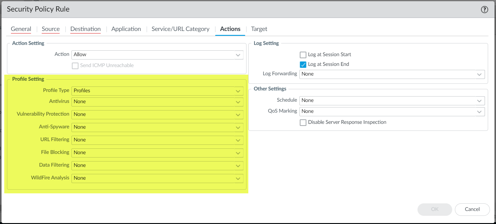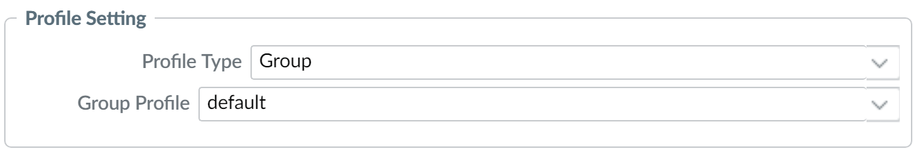 Override a default security profile group.If you have an existing default security profile group, and you do not want that set of profiles to be attached to a new Security policy, you can continue to modify the Profile Setting fields according to your preference. Begin by selecting a different Profile Type for your policy (PoliciesSecuritySecurity Policy RuleActions).