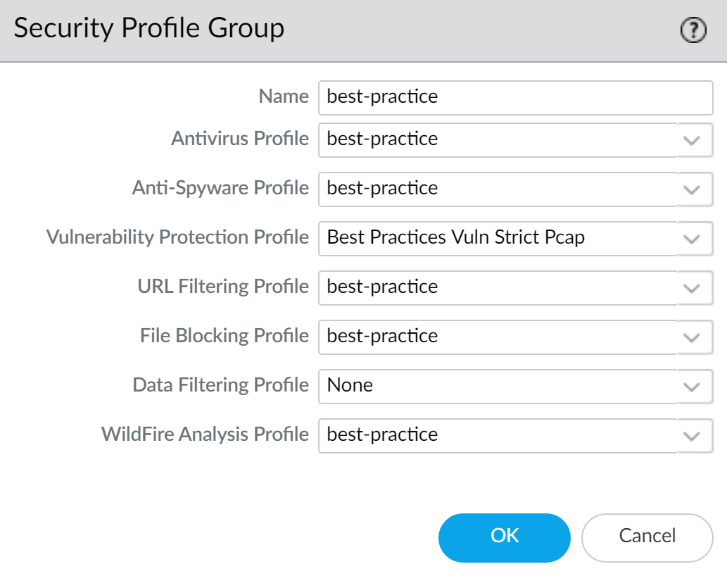 Click OK to save the profile group.Add your security profile to a Security policy.- Select PoliciesSecurity and Add or modify a security security rule.Select the Actions tab.In the Profile Setting section, select Profiles for the Profile Type.Select the profiles you want to add to your security rule.