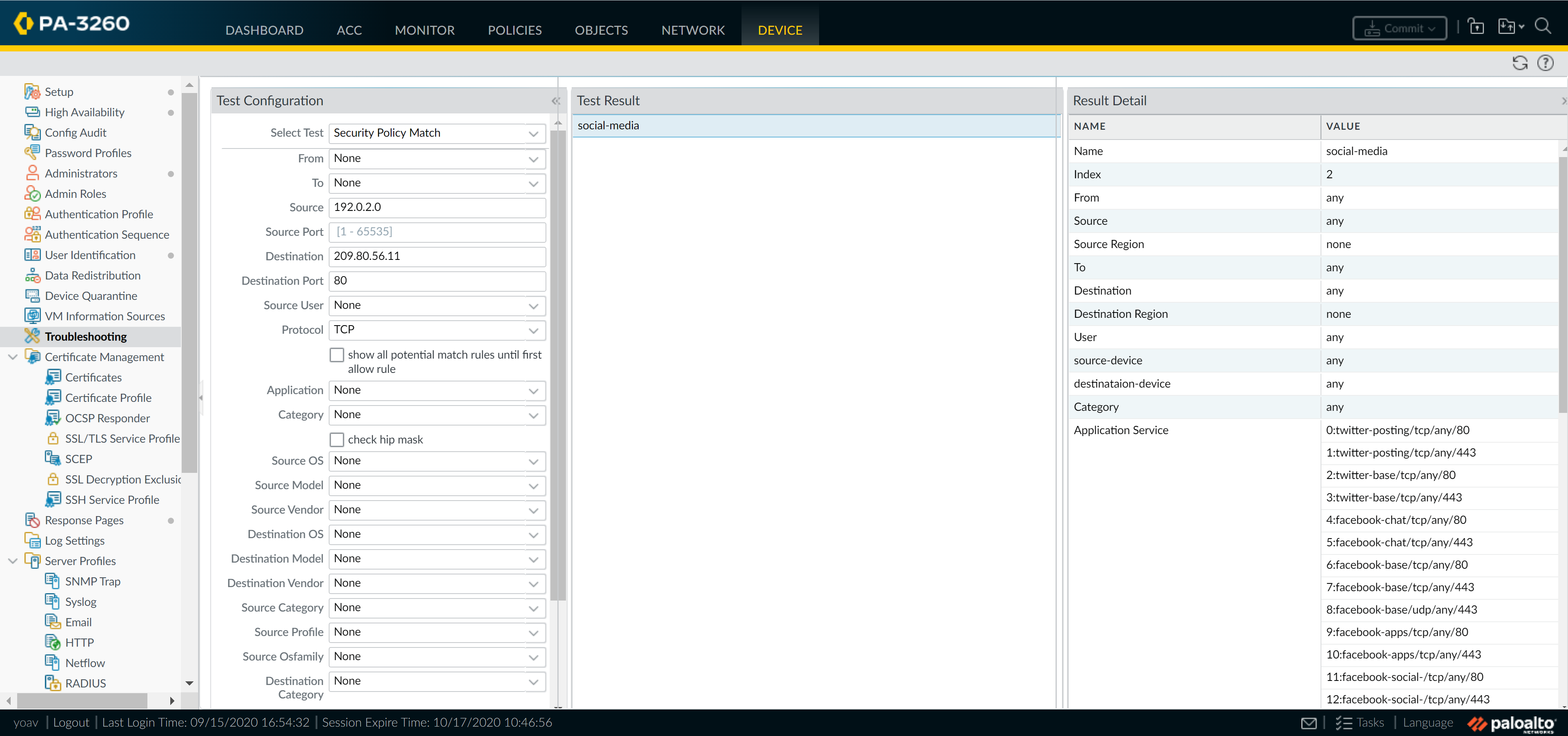 As a best practice, don't select the check box to Disable Server Response Inspection (DSRI). Selecting this option prevents the firewall from inspecting packets from the server to the client. For the best security posture, the firewall must inspect both the client-to-server flows and the server-to-client flows to detect and prevent threats.Attach security profiles to enable the firewall to scan all allowed traffic for threats.Make sure you create best practice security profiles that help protect your network from both known and unknown threats.In the Actions tab, select Profiles from the Profile Type drop-down and then select the individual security profiles to attach to the rule.Alternatively, select Group from the Profile Type drop-down and select a security Group Profile to attach.Click Commit to save the security rule to the running configuration on the firewall.To verify that you have set up your basic Security policies effectively, test whether your security rules are being evaluated and determine which security rule applies to a traffic flow.The output displays the best rule that matches the source and destination IP address specified in the CLI command.For example, to verify the security rule that will be applied for a server in the data center with the IP address 208.90.56.11 when it accesses the Microsoft update server:- Select DeviceTroubleshooting, and select Security Policy Match from the Select Test drop-down.Enter the Source and Destination IP addresses.Enter the Protocol.Execute the Security policy match test.
